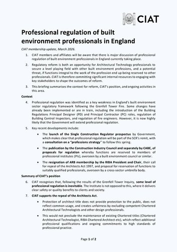 Since I wrote to you in December, discussions have moved forward with Government publishing a prospectus for the Single Construction Regulator and RIBA providing further details on their campaign for repeal of the Architect’s Act. Proposals for reform are also under discussion by the Construction Industry Council and others.